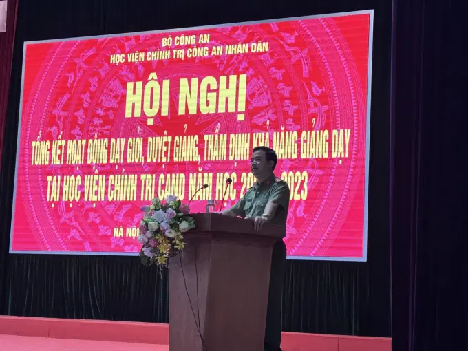 Thực hiện chương trình, nhiệm vụ công tác năm học; sáng ngày 12/9/2023, Học viện Chính trị Công an nhân dân tổ chức Hội nghị tổng kết hoạt động dạy giỏi, duyệt giảng, thẩm định khả năng giảng dạy, năm học 2022 - 2023. Đồng chí Đại tá, TS Tống Văn Khuông, Phó Giám đốc Học viện chủ trì Hội nghị. Tham dự Hội nghị có đại diện lãnh đạo các đơn vị, lãnh đạo các Khoa và toàn thể giảng viên Học viện.