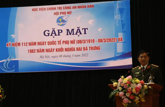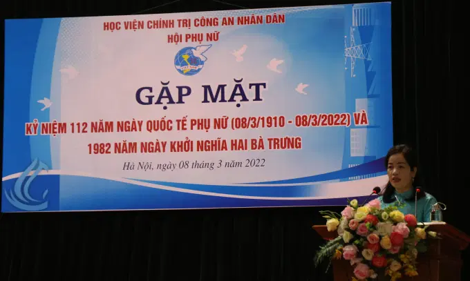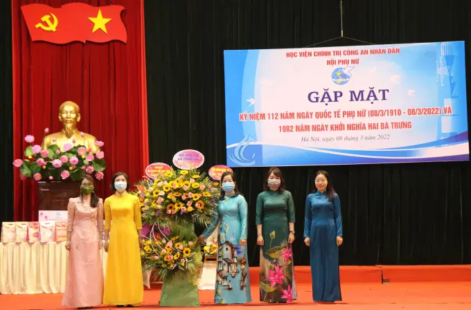 Sáng ngày 08/3/2022, tại Học viện Chính trị CAND, Hội Phụ nữ Học viện đã tổ chức Gặp mặt Kỷ niệm 112 năm ngày Quốc tế Phụ nữ 08/3, 1982 năm ngày Khởi nghĩa Hai Bà Trưng và triển khai công tác Hội và phong trào phụ nữ năm 2022. Dự và chỉ đạo buổi lễ, về phía Học viện Chính trị CAND có đồng chí Trung tướng, PGS.TS Trần Vi Dân, Bí thư Đảng ủy, Giám đốc Học viện; đồng chí Thiếu tướng, TS Nguyễn Như Lôi, Ủy viên BTV Đảng ủy, Phó Giám đốc Học viện, đồng chí Đại tá, TS Tống Văn Khuông, Ủy viên BTV Đảng ủy, Phó Giám đốc Học viện. Về phía đại biểu khách mời có đồng chí Trung tá Trần Thanh Hương Lan, Phó Chủ tịch Hội Phụ nữ Bộ Công an, đồng chí Trung tá Mè Quang Điệp, Trung đoàn Cảnh sát cơ động số 1, Bộ Tư lệnh Cảnh sát cơ động. Tham dự chương trình còn có đại diện lãnh đạo các đơn vị, các tổ chức quần chúng thuộc Học viện và toàn thể hội viên phụ nữ Học viện.