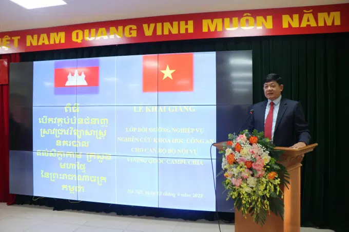 Đồng chí Trung tướng, PGS.TS Trần Vi Dân, Cục trưởng Cục V04 phát biểu Khai giảng lớp Bồi dưỡng nghiệp vụ nghiên cứu khoa học công an cho cán bộ Bộ Nội vụ Vương quốc Campuchia