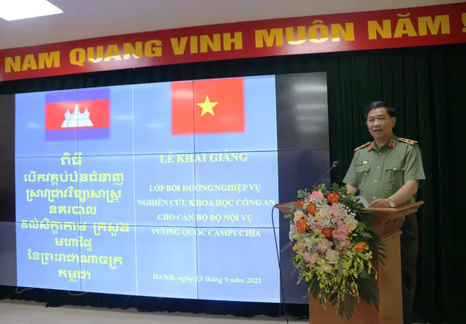 Khai giảng Lớp Bồi dưỡng nghiệp vụ nghiên cứu khoa học công an cho cán bộ Bộ Nội vụ Vương quốc Camphuchia