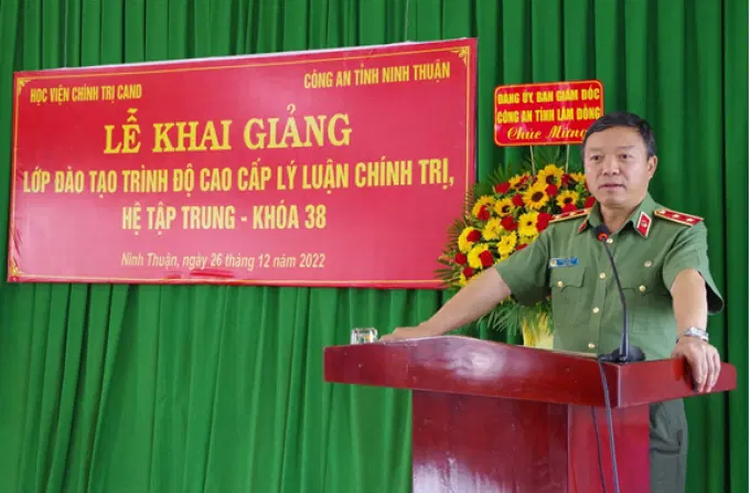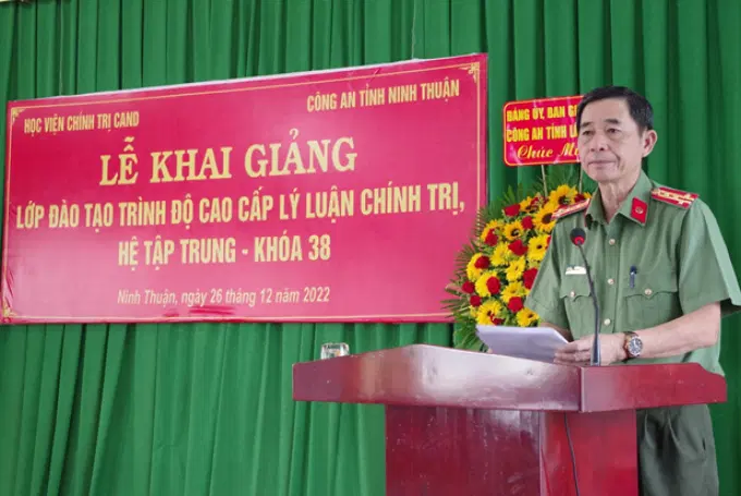 Thực hiện Kế hoạch số 3044/KH-T03-P3, ngày 19/12/2022 của Học viện Chính trị Công an nhân dân về tổ chức Lễ Khai giảng lớp đào tạo trình độ cao cấp lý luận chính trị, hệ tập trung - Khóa 38; ngày 26/12/2022, Học viện Chính trị Công an nhân dân phối hợp với Công an tỉnh Ninh Thuận long trọng tổ chức khai giảng khóa học. Dự và chủ trì buổi lễ có đồng chí Trung tướng, PGS.TS Phan Xuân Tuy, Bí thư Đảng ủy, Giám đốc Học viện Chính trị Công an nhân dân. Tham dự có đồng chí Đại tá Huỳnh Tấn Hạnh, Ủy viên Ban Thường vụ Tỉnh ủy, Bí thư Đảng ủy, Giám đốc Công an tỉnh Ninh Thuận; Đại tá Lê Hồng Phong, tỉnh ủy viên, Phó Bí thư Đảng ủy, Phó Giám đốc Công an tỉnh Lâm Đồng; Đại tá Huỳnh Cầm, Tỉnh ủy viên, Phó Bí thư Đảng ủy, Phó Giám đốc Công an tỉnh Ninh Thuận; đại diện lãnh đạo Ban Tuyên giáo Tỉnh ủy, Ban Tổ chức Tỉnh ủy, Trường Chính trị tỉnh Ninh Thuận; đại diện Công an tỉnh Khánh Hòa, Công an tỉnh Bình Thuận; Ban Giám thị Trại giam Sông Cái; đại diện lãnh đạo Văn phòng Học viện, Phòng Quản lý đào tạo và bồi dưỡng nâng cao Học viện Chính trị Công an nhân dân; đại diện lãnh đạo phòng chức năng Công an tỉnh Ninh Thuận cùng toàn thể học viên lớp học.