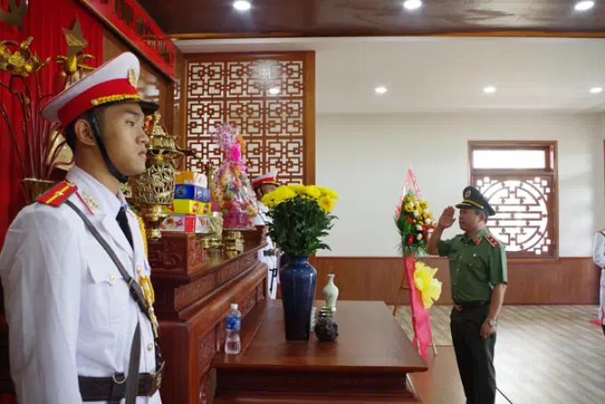 Đồng chí Giám đốc Học viện cùng các đồng chí đại biểu, học viên lớp học dâng hương tại Nhà tưởng niệm Chủ tịch Hồ Chí Minh trong khuôn viên Công an tỉnh Ninh Thuận