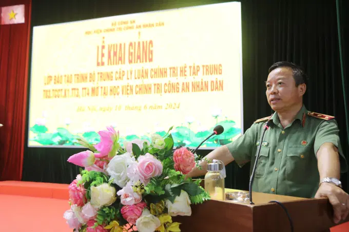 Phát biểu tại buổi lễ, đồng chí Trung tướng Phan Xuân Tuy, Giám đốc Học viện chào mừng các đồng chí học viên đến học tập tại Học viện; đồng thời nhấn mạnh với các đồng chí học viên về vai trò, ý nghĩa của việc học tập, bồi dưỡng lý luận chính trị, là nội dung mà Đảng ủy Công an Trung ương, lãnh đạo Bộ rất quan tâm. Qua đó, đồng chí yêu cầu các học viên lớp học cần nêu cao tinh thần trách nhiệm, gương mẫu, tuân thủ mọi quy định, nội quy học tập, quy chế đào tạo, chấp hành nghiêm túc giờ giấc, điều lệnh CAND, ăn ở tập trung tại Học viện; đồng thời nhanh chóng chuyển thủ tục sinh hoạt đảng, thành lập chi bộ tạm thời và công bố cấp uỷ chi bộ, đưa công tác sinh hoạt Đảng vào quy củ. Đề nghị học viên sớm ổn định, xác định rõ mục tiêu học tập, rèn luyện, biến quá trình bồi dưỡng thành quá trình tự bồi dưỡng; với tinh thần tiếp tục thực hiện thắng lợi Nghị quyết số 12-NQ/TW ngày 16/3/2022 của Bộ Chính trị về đẩy mạnh xây dựng lực lượng Công an nhân dân thật sự trong sạch, vững mạnh, chính quy, tinh nhuệ, hiện đại, đáp ứng yêu cầu, nhiệm vụ trong tình hình mới, chuẩn bị tiến tới Đại hội Đảng các cấp nhiệm kỳ 2025 – 2030; chào mừng 76 năm ngày Chủ tịch Hồ Chí Minh ra Lời kêu gọi Thi đua ái quốc (11/6/1948 - 11/6/2024), đồng chí Giám đốc Học viện mong muốn học viên lớp học phát huy tinh thần đoàn kết, phấn đấu nỗ lực thi đua học tập, rèn luyện, đồng thời thực hiện tốt các nhiệm vụ, định hướng và chương trình của Học viện triển khai.