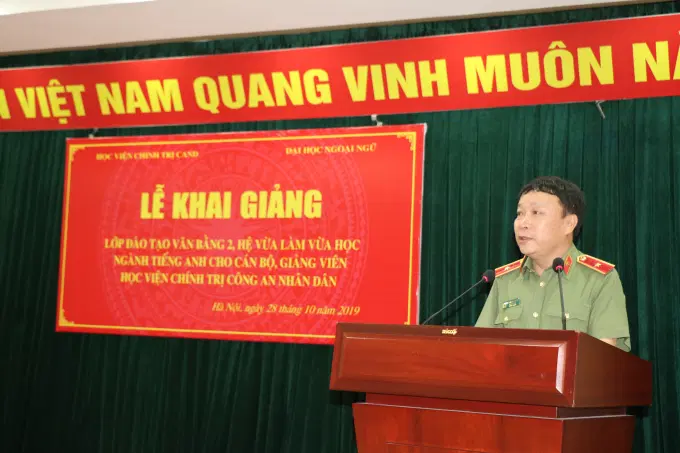 Phát biểu chỉ đạo buổi Lễ, đồng chí Thiếu tướng Dương Như Hồng, Phó Giám đốc Học viện nhấn mạnh: Trong xu thế toàn cầu hóa và hội nhập quốc tế như hiện nay, xác định tầm quan trọng và cần thiết của ngoại ngữ trong công tác giáo dục, đào tạo, Học viện Chính trị Công an nhân dân đã liên kết với Trường Đại học Ngoại ngữ, Đại học Quốc gia Hà Nội tổ chức Lớp Đào tạo văn bằng 2, hệ vừa làm vừa học, ngành Tiếng Anh cho cán bộ, giảng viên của Học viện. Để đạt được các mục tiêu, yêu cầu đề ra, Ban Giám hiệu Trường Đại học Ngoại ngữ - Đại học Quốc gia Hà Nội đã tích cực phối hợp với Học viện xây dựng lịch trình phù hợp và lựa chọn, cử các chuyên gia, giảng viên có chuyên môn, kinh nghiệm tham gia giảng dạy. Đồng chí Phó Giám đốc đề nghị các đơn vị chức năng có liên quan của Học viện cần phối hợp chặt chẽ, bảo đảm các điều kiện tốt nhất cho lớp học; tổ chức quản lý lớp học theo các quy định của Bộ Công an, Bộ Giáo dục và Đào tạo, của Học viện và Trường Đại học Ngoại ngữ - Đại học Quốc gia Hà Nội. Học viên của lớp học cần có thái độ nghiêm túc, cầu thị, chủ động, tích cực học hỏi, lĩnh hội các kiến thức.