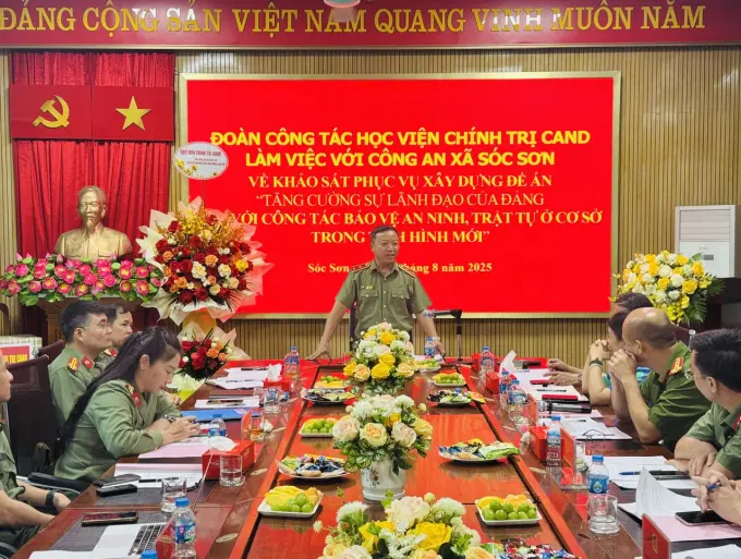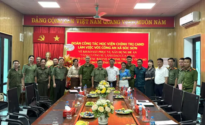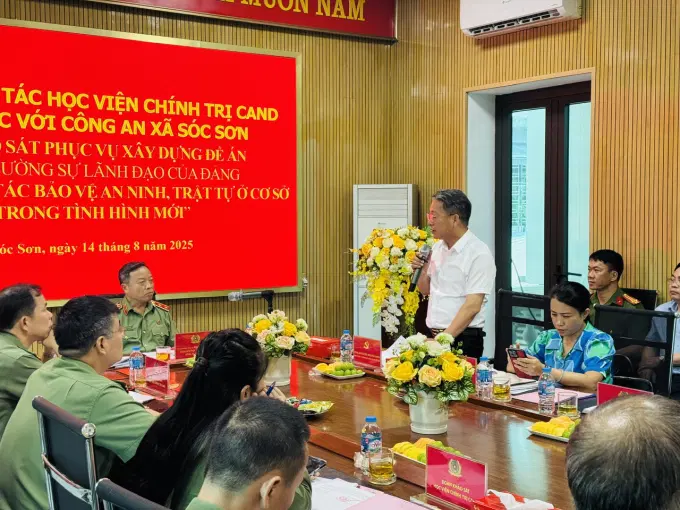 Thực hiện Quyết định của Bộ trưởng Bộ Công an về việc thành lập Ban Chỉ đạo và Tổ giúp việc xây dựng Đề án “Tăng cường sự lãnh đạo của Đảng đối với công tác bảo đảm an ninh, trật tự ở cơ sở trong tình hình mới”, đồng chí Trung tướng, PGS,TS, NGƯT Phan Xuân Tuy, Bí thư Đảng ủy, Giám đốc Học viện với vai trò là Thành viên Ban chỉ đạo xây dựng Đề án, Trưởng Đoàn khảo sát cùng 12 thành viên đã tổ chức buổi khảo sát đánh giá thực trạng tình hình bảo vệ an ninh, trật tự tại Công an xã Sóc Sơn, Thành phố Hà Nội ngày 14/8/2025. Tham gia buổi làm việc có đại diện của Đảng ủy, Uỷ ban nhân dân xã và Công an xã Sóc Sơn gồm 29 đại biểu.