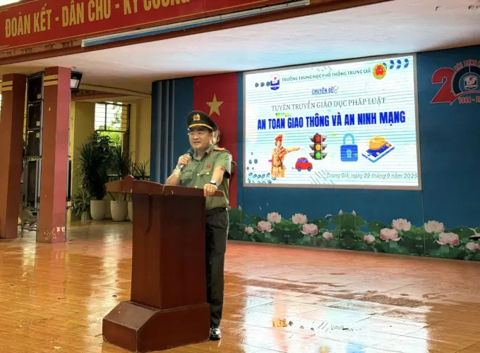 Theo đề nghị của Công an xã Trung Giã, thành phố Hà Nội về việc phối hợp tuyên truyền pháp luật cho học sinh trên địa bàn xã. Được sự đồng ý của Giám đốc Học viện, ngày 29/9/2025, Khoa Luật, Phòng Quản lý học viên, Học viện Chính trị Công an nhân dân phối hợp với Công an xã Trung Giã tổ chức tuyên truyền, phổ biến, giáo dục pháp luật với chủ đề: “An toàn giao thông và an ninh mạng” cho gần 1000 em học sinh Trường THPT Trung Giã.