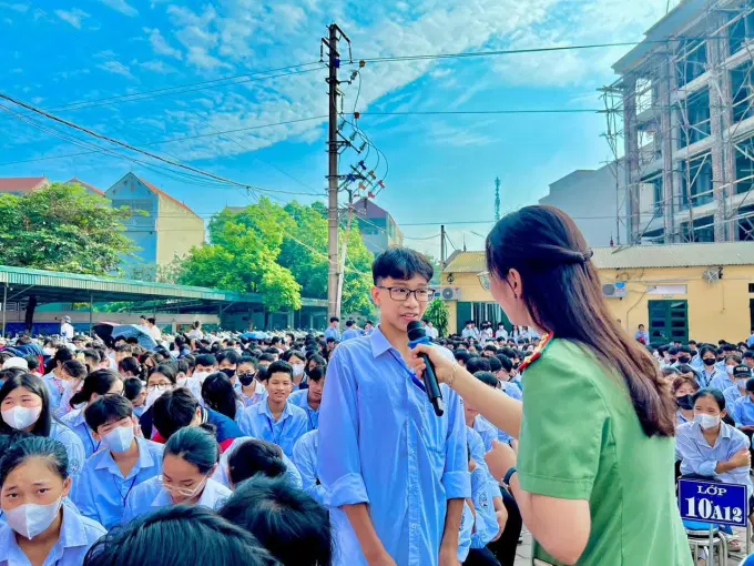 Đồng chí Đại úy, ThS Nguyễn Thị Hạnh Quyên thực hiện các nội dung tuyên truyền tại Trường THPT Lam Hồng, Sóc Sơn, Hà Nội