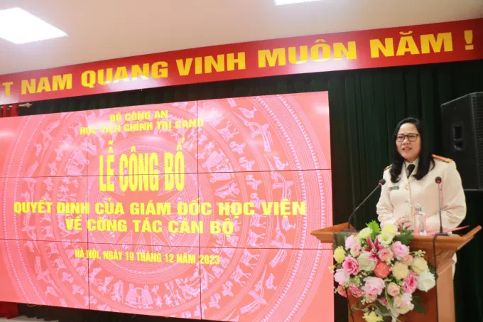 Chiều ngày 19/12/2023, Học viện Chính trị CAND đã trang trọng tổ chức Lễ Công bố các quyết định về công tác cán bộ. Đồng chí Trung tướng, PGS. TS Phan Xuân Tuy, Bí thư Đảng ủy, Giám đốc Học viện dự và chủ trì buổi lễ; tham dự buổi lễ có các đồng chí trong Ban Thường vụ Đảng ủy, Ban Giám đốc Học viện; các đồng chí Ủy viên Ban Chấp hành Đảng bộ Học viện, lãnh đạo chủ chốt các đơn vị thuộc Học viện.