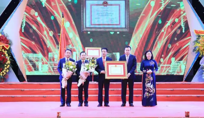 Phó Bí thư Thường trực Thành ủy Hà Nội Nguyễn Thị Tuyến trao Huân chương lao động hạng Ba và trao Bằng công nhận huyện Sóc Sơn đạt chuẩn nông thôn mới.