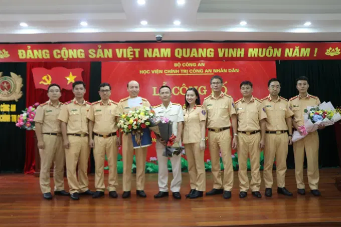 Đại diện lãnh đạo đơn vị chức năng, cán bộ, chiến sĩ các đơn vị thuộc Học viện Chính trị Công an nhân dân, Cục Cảnh sát giao thông chúc mừng các đồng chí được bổ nhiệm