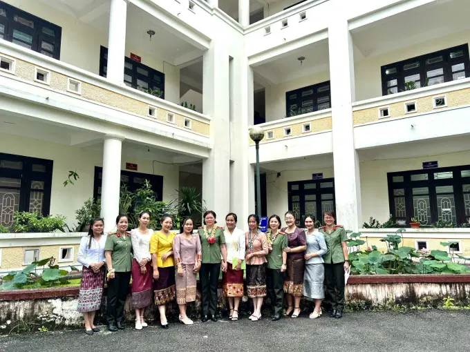 Đồng chí Thiếu tướng Đinh Ngọc Hoa, Phó Bí thư Đảng uỷ, Phó Giám đốc Học viện và đại diện Ban Chấp hành HPN Học viện chụp ảnh với Học viên Lào tại lễ ra mắt phần việc