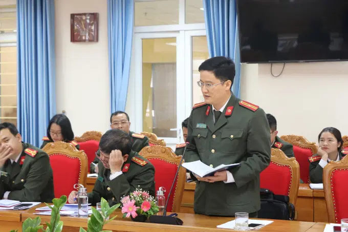 Đồng chí Thượng tá, PGS.TS Lê Trọng Hanh, Trưởng Khoa Xây dựng Đảng và chính quyền nhà nước, Học viện Chính trị Công an nhân dân phát biểu