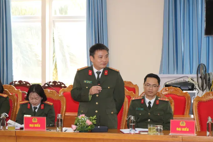 Đồng chí Thiếu tá Nguyễn Quang Chiến, Cục Khoa học, chiến lược và lịch sử công an phát biểu