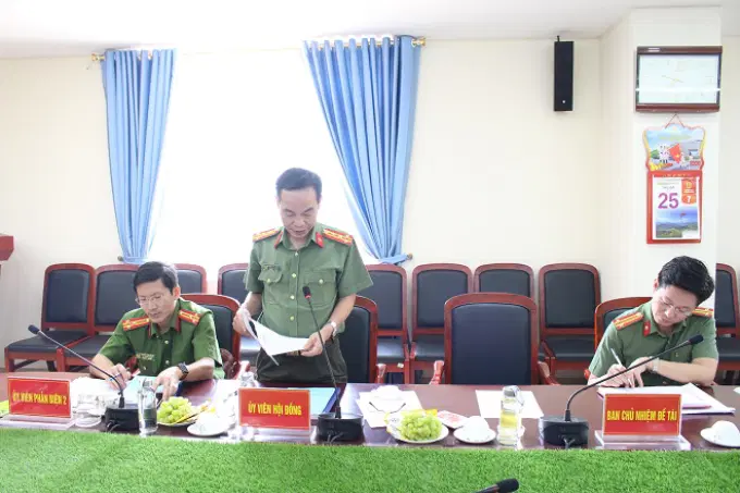 Đồng chí Đại tá Đinh Tuấn Khánh, Phó Trưởng Khoa, Khoa Nghiệp vụ cơ bản, Học viện Chính trị Công an nhân dân, Ủy viên Hội đồng phát biểu tại buổi nghiệm thu