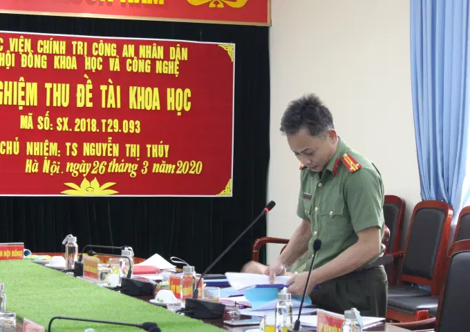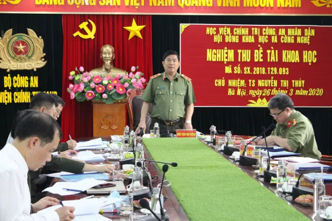 Sáng ngày 26/3/2020, Học viện Chính trị Công an nhân dân tổ chức nghiệm thu Đề tài khoa học cấp cơ sở: “Nâng cao chất lượng bồi dưỡng lý luận chính trị đối với chức danh lãnh đạo cấp Phòng trong Công an nhân dân”, mã số: SX.2018.T29.093 do Trung tá, TS Nguyễn Thị Thúy, Phó Trưởng Khoa Kinh tế chính trị làm chủ nhiệm. Đồng chí Trung tướng, PGS. TS Trần Vi Dân, Giám đốc Học viện là Chủ tịch Hội đồng. Tham gia buổi nghiệm thu có các thành viên trong Hội đồng nghiệm thu và đại diện lãnh đạo, giảng viên các khoa, bộ môn thuộc Học viện.