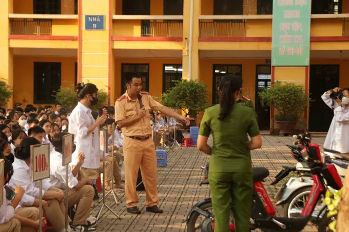 Trước giờ tuyên truyền, toàn thể cán bộ, giáo viên và học sinh nhà tường cùng đại biểu tham dự làm Lễ Chào cờ và dành một phút tưởng niệm các nạn nhân tử vong trong vụ cháy chung cư mini tại phường Khương Đình, quận Thanh Xuân, Tp. Hà Nội ngày 12/9/2023. Buổi tuyên truyền gồm 02 nội dung: (1) đồng chí Đại úy Nguyễn Kim Thỏa, cán bộ Đội Cảnh sát giao thông, trật tự Công an huyện Sóc Sơn tuyên truyền, phổ biến về văn hóa giao thông, hướng dẫn pháp luật về trật tự, an toàn khi tham gia giao thông và trao đổi những vấn đề liên quan khác. Qua đó, giúp cán bộ, giáo viên và các em học sinh nắm được các quy định pháp luật hiện hành về trật tự, an toàn giao thông, các hành vi bị cấm và chế tài xử lý khi vi phạm, góp phần nâng cao ý thức, trách nhiệm của bản thân trong đảm bảo trật tự, an toàn khi tham gia giao thông để bảo vệ chính mình và người khác; (2) đồng chí Trung tá Đặng Thanh Tùng, Phó Trưởng khoa Khoa Nghiệp vụ cơ bản tuyên truyền, phổ biến về Luật An ninh mạng, hướng dẫn sử dụng mạng xã hội an toàn, văn minh, đúng pháp luật. Nội dung tuyên truyền nhằm định hướng cho các em học sinh cách sử dụng mạng xã hội một cách hữu ích, cách bảo vệ thông tin trên mạng xã hội; ứng xử có văn hóa trên mạng xã hội… Qua đó, nâng cao hiểu biết về Luật An ninh mạng, hạn chế những ảnh hưởng tiêu cực của mạng xã hội đối với lứa tuổi học sinh, góp phần tạo môi trường lành mạnh trên không gian mạng và giảm thiểu rủi ro khi tham gia các hoạt động trên không gian mạng của các em học sinh.