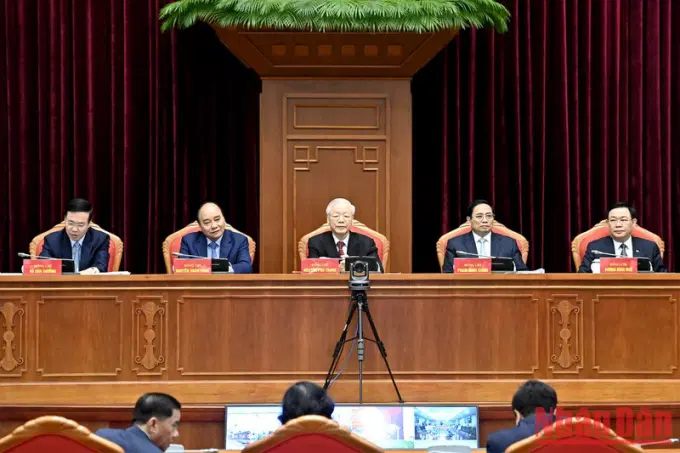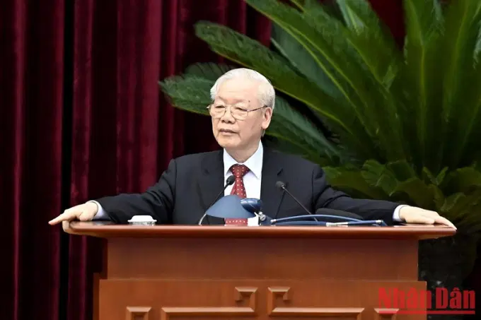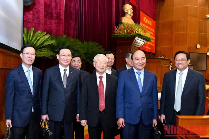 Tổng Bí thư Nguyễn Phú Trọng dự và chủ trì hội nghị. Cùng chủ trì có các đồng chí: Chủ tịch nước Nguyễn Xuân Phúc, Thủ tướng Chính phủ Phạm Minh Chính, Chủ tịch Quốc hội Vương Đình Huệ và đồng chí Võ Văn Thưởng, Ủy viên Bộ Chính trị, Thường trực Ban Bí thư.