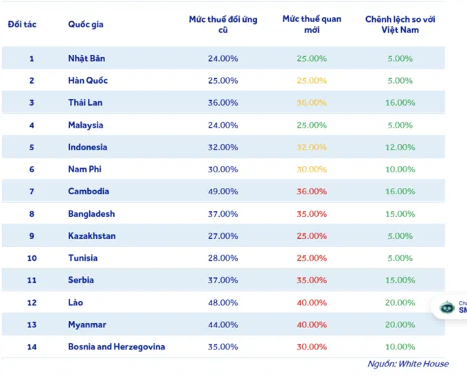 Ngày 08/7/2025, chính quyền Tổng thống Donald Trump đã chính thức gửi thư thông báo mức thuế quan mới áp dụng từ ngày 01/8 tới cho 15 quốc gia chưa đạt thỏa thuận thương mại với Mỹ. Tổng thống Trump cũng cảnh báo nếu các quốc gia trên trả đũa bằng cách tăng thuế hàng Mỹ, mức thuế sẽ bị cộng thêm tương ứng. Hiệu lực của mức thuế mới này sẽ từ 1/8/2025. Việt Nam đang giữ được lợi thế tương đối trong khu vực khi mức 20% đang thấp hơn các nước trong khu vực Đông Nam Á và thấp hơn nhiều so với mức 46% trước đây. Trong khi đó, nhiều quốc gia ASEAN khác như Thái Lan, Campuchia (36%), Indonesia (32%) hay Lào và Myanmar (40%) đang đối mặt với mức thuế cao hơn đáng kể.