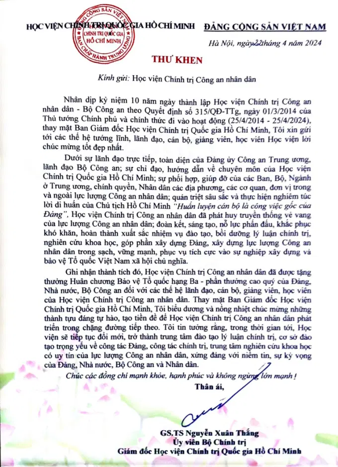 Nhân dịp kỷ niệm 10 năm ngày thành lập Học viện Chính trị Công an nhân dân (01/3/2014 - 01/3/2024) và chính thức đi vào hoạt động (25/4/2014 - 25/4/2024), đồng chí GS.TS Nguyễn Xuân Thắng, Ủy viên Bộ Chính trị, Giám đốc Học viện Chính trị Quốc gia Hồ Chí Minh đã gửi Thư khen, chúc mừng các thế hệ tướng lĩnh, lãnh đạo, cán bộ, giảng viên, học viên Học viện. Trang Thông tin điện tử Học viện Chính trị CAND xin giới thiệu nội dung bức thư: