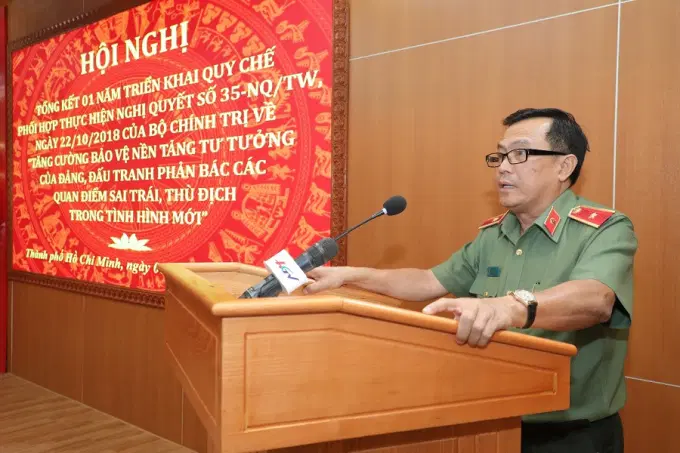 Trung tướng, PGS, TS. Phan Xuân Tuy, Bí thư Đảng ủy, Giám đốc Học viện Chính trị Công an nhân dân; Thành viên Ban chỉ đạo 35 Bộ Công an phát biểu tại Hội nghị.