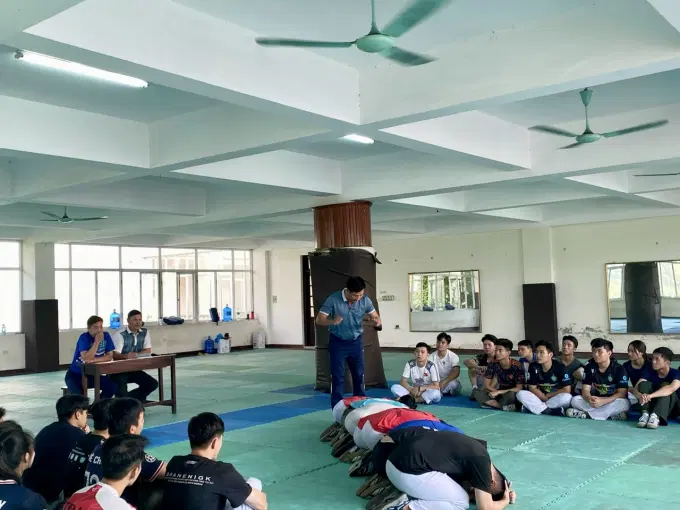 Đồng chí Thiếu tá Nguyễn Trung Kiên, giảng viên Khoa Quân sự, Võ thuật, Thể dục, Thể thao thực hiện Thao giảng