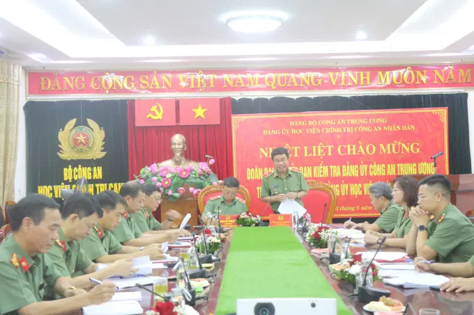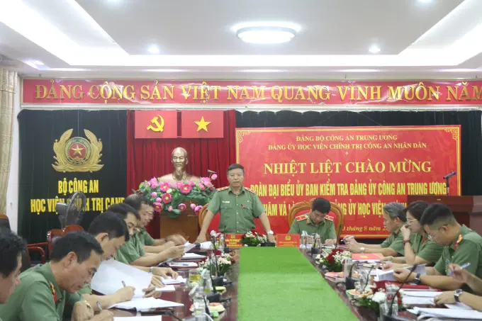 Phát biểu chào mừng Đoàn đại biểu Ủy ban Kiểm tra Đảng ủy Công an Trung ương, đồng chí Trung tướng, PGS.TS Phan Xuân Tuy, Bí thư Đảng ủy, Giám đốc Học viện bày tỏ niềm vui mừng được đón tiếp Đoàn đại biểu Ủy ban Kiểm tra Đảng ủy Công an Trung ương đến thăm, làm việc với Đảng bộ Nhà trường ngay trong tuần đầu năm học mới 2023-2024, Đảng ủy Học viện đang lãnh đạo, chỉ đạo các đơn vị khẩn trương triển khai toàn diện các mặt công tác năm học 2023-2024. Đồng chí nhấn mạnh mối quan hệ phối hợp tốt đẹp giữa Học viện và Ủy ban Kiểm tra Đảng ủy Công an Trung ương. Ngay từ những ngày đầu sau khi thành lập, nhằm tăng cường, phát triển mối quan hệ giữa hai đơn vị trên nhiều lĩnh vực, nhất là việc phối hợp trong công tác nghiên cứu khoa học, đào tạo, bồi dưỡng nghiệp vụ công tác xây dựng Đảng, công tác kiểm tra, giám sát đối với đội ngũ cấp ủy, cán bộ kiểm tra, giám sát trong CAND, Đảng ủy Học viện Chính trị CAND đã ký kết Quy chế phối hợp với Ủy ban Kiểm tra Đảng ủy Công an Trung ương. Theo đó, hằng năm Học viện đã cử cán bộ, giảng viên phối hợp xây dựng chương trình, tài liệu giảng dạy và tham gia giảng dạy các chuyên đề về công tác xây dựng Đảng, công tác kiểm tra, giám sát cho các lớp tập huấn công tác kiểm tra, giám sát do Đảng ủy Công an Trung ương, Công an các đơn vị, địa phương tổ chức. Trong đó, đồng chí Bí thư Đảng ủy, Giám đốc Học viện được mời tham gia giảng dạy nhiều chuyên đề cho các lớp tập huấn nói trên.