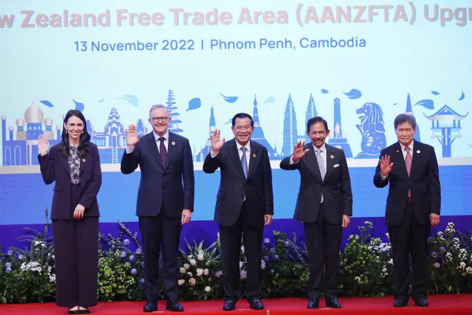 Thủ tướng Campuchia, Chủ tịch ASEAN 2022 Samdech Techo Hun Sen cùng Thủ tướng New Zealand Jacinda Ardern, Thủ tướng Australia Anthony Albanese, Quốc vương Brunei Hassanal Bolkiah và Tổng thư ký ASEAN Dato Lim Jock Hoi chụp ảnh chung tại hội nghị EAS.